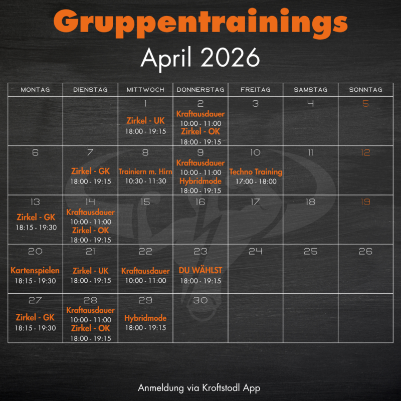 Trainiere mit deinem 10er-Block Gruppentraining um 9,90€ pro Training. Oder werde Mitglied im Kroftstodl – dann ist jedes Gruppentraining inkludiert. Ob Kroftlackl oder Frischling – unsere Top-Trainer bringen dich und deine Spezis in die Welt von Fitness und Gesundheit.